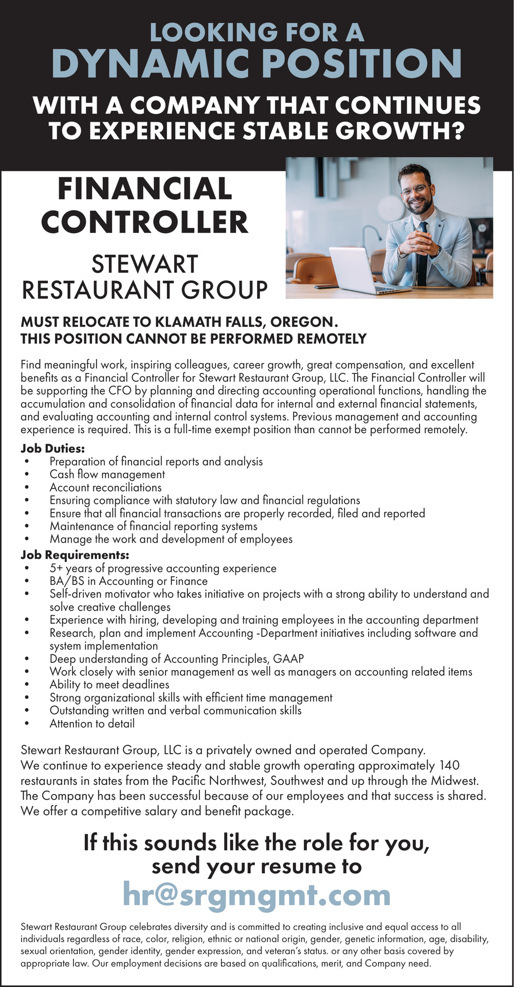 Mar 07, 2026. Stewart Restaurant Group, LLC Accounting/Financial Jobs from Klamath Falls Jobs