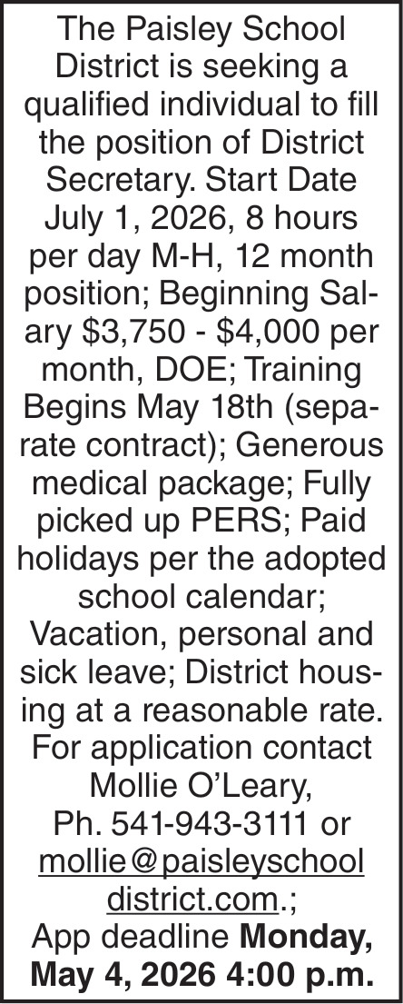 Apr 16, 2026. Paisley School District Administration Jobs from Klamath Falls Jobs